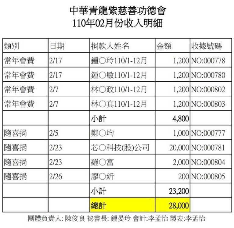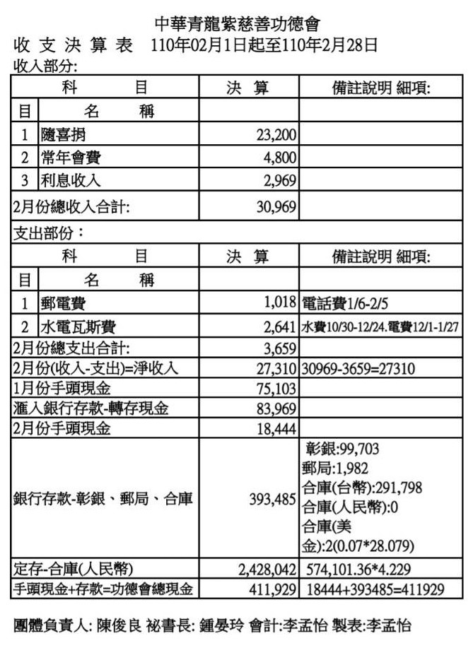 110年2月收支決算表與收入明細表