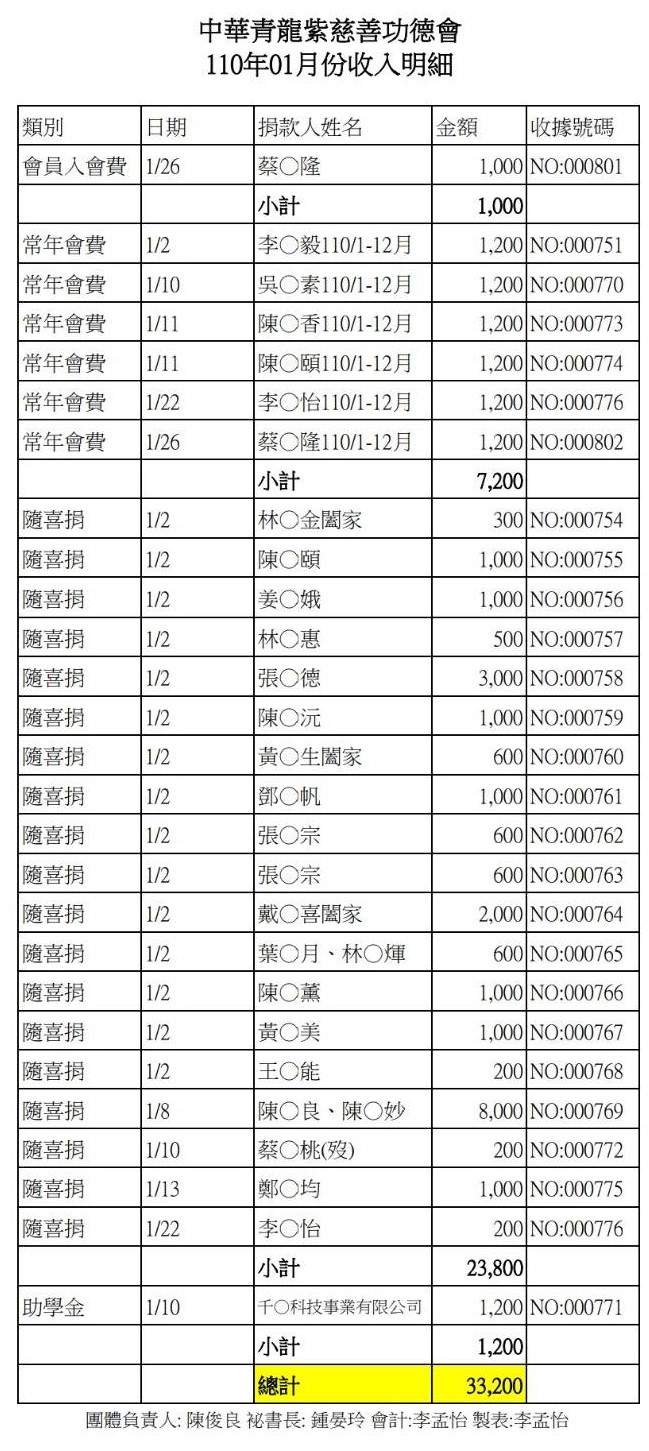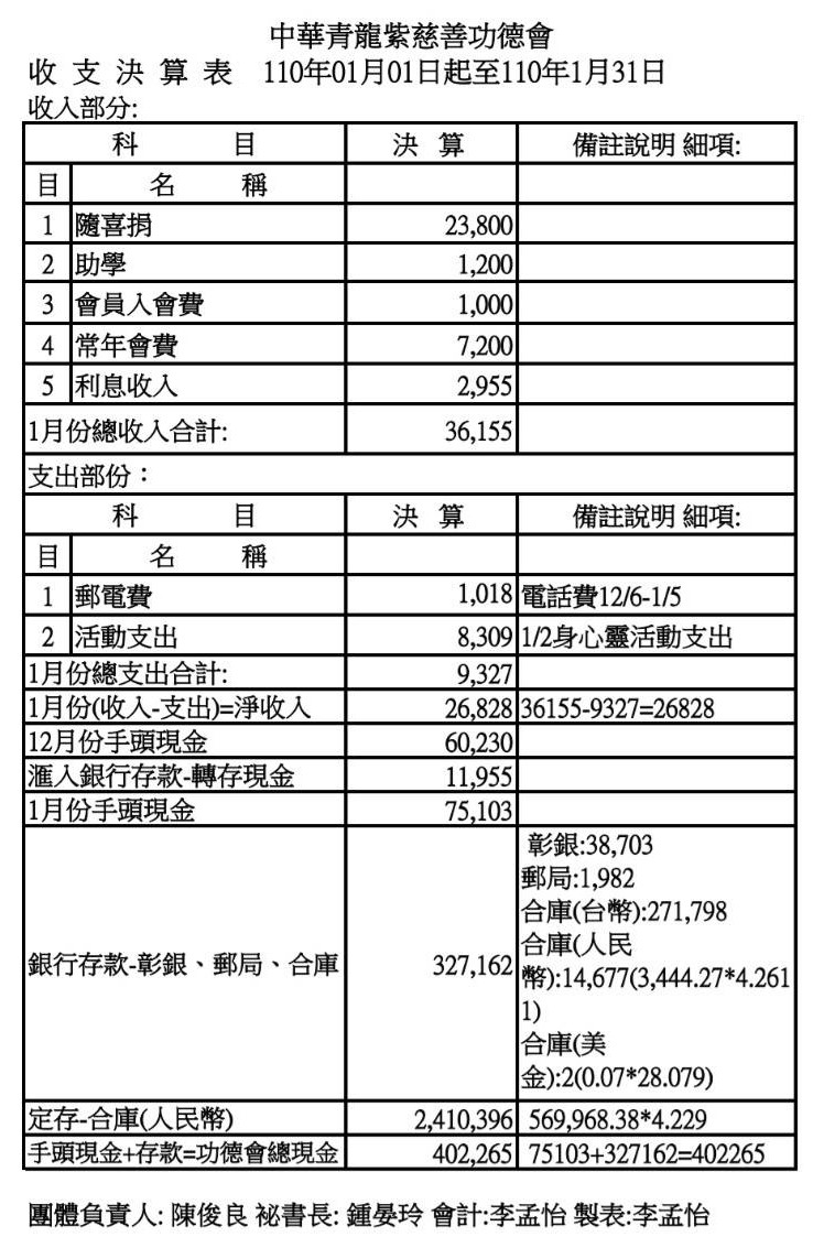 110年1月收支決算表與收入明細表