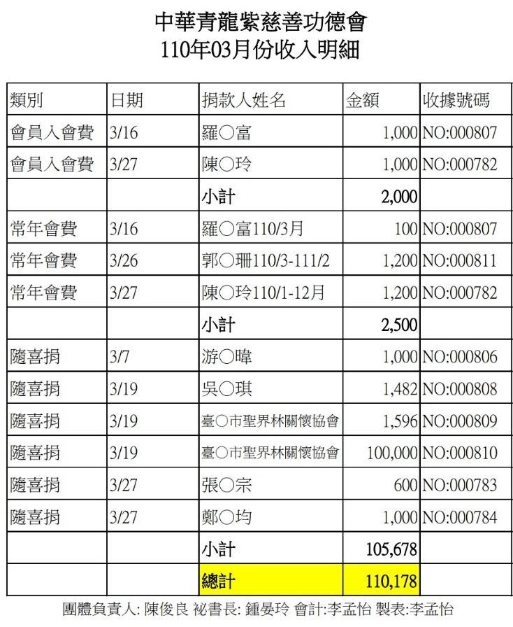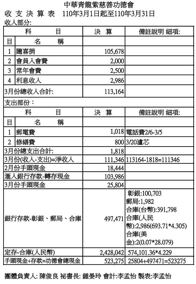 110年3月收支決算表與收入明細表