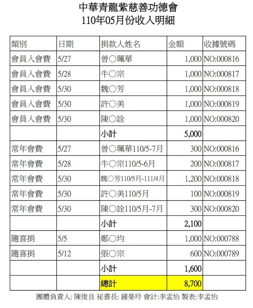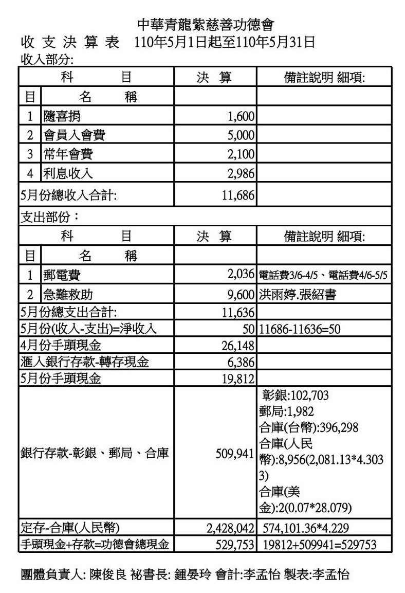 110年5月收支決算表與收入明細表
