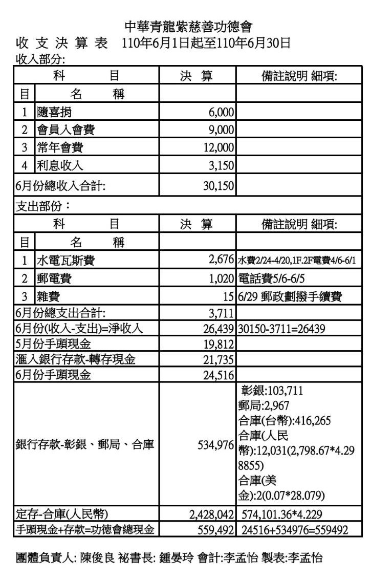 110年6月收支決算表與收入明細表