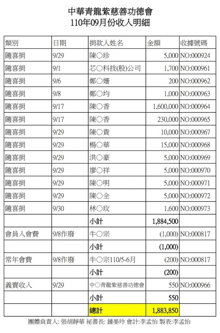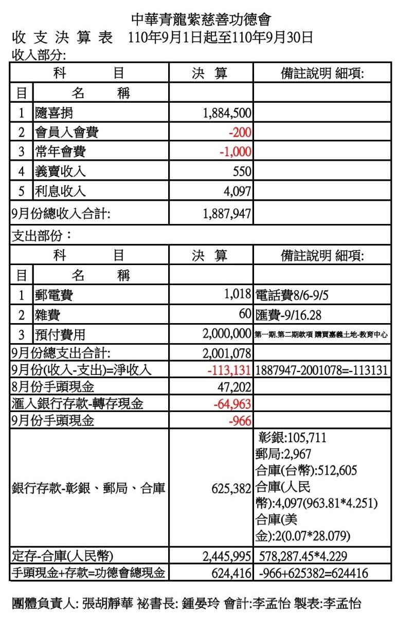 110年9月收支決算表與收入明細表