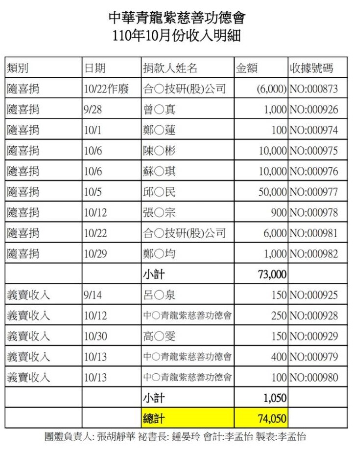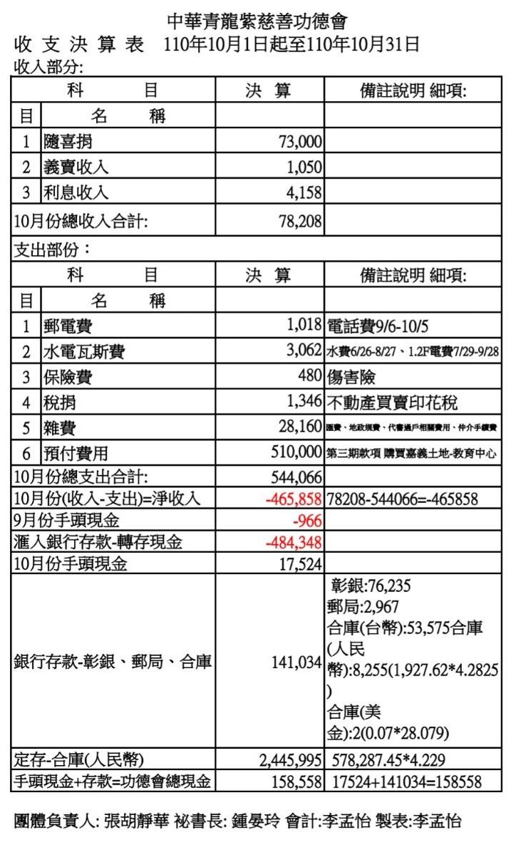 110年10月收支決算表與收入明細表
