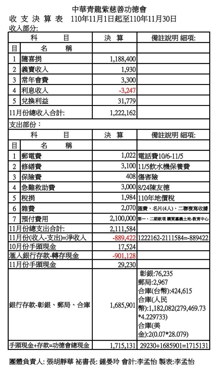110年11月收支決算表與收入明細表