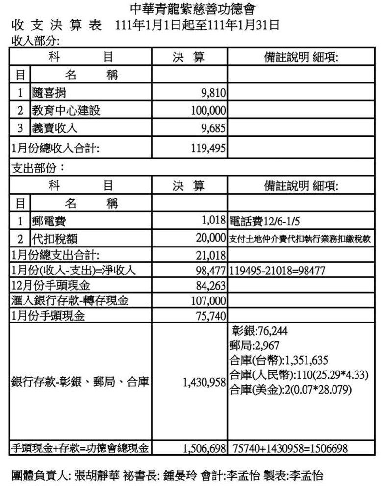 111年1月收支決算表與收入明細表