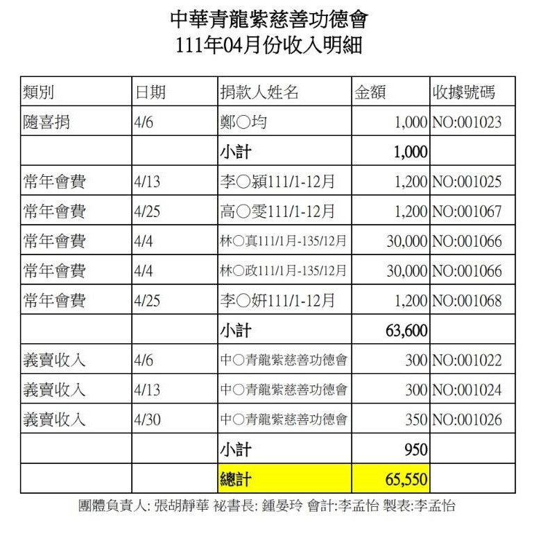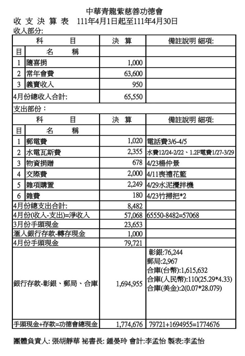 111年4月收支決算表與收入明細表