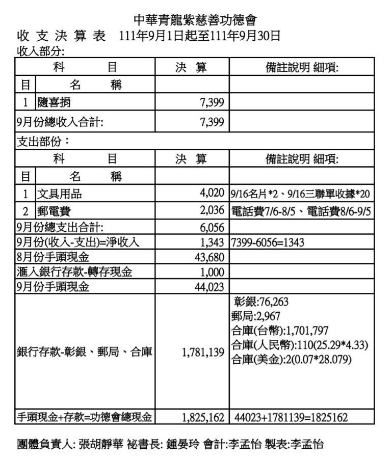 111年9月收支決算表與收入明細表