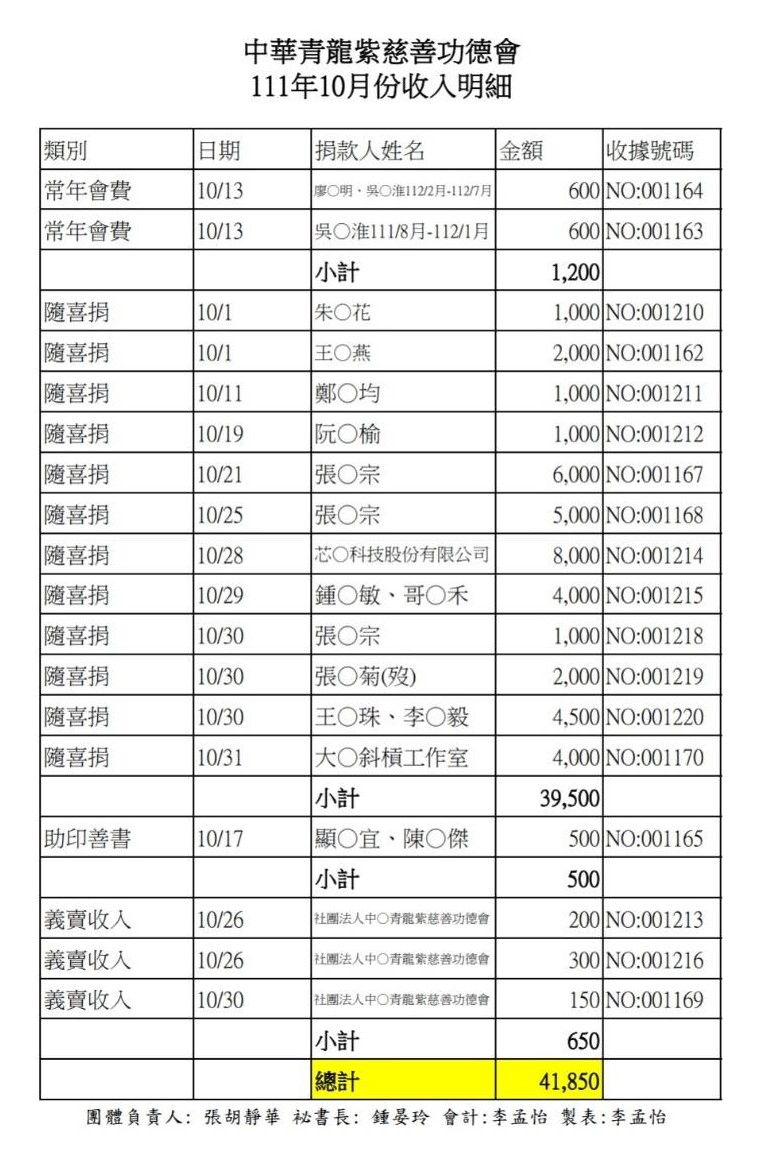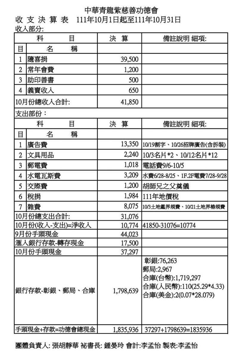 111年10月收支決算表與收入明細表