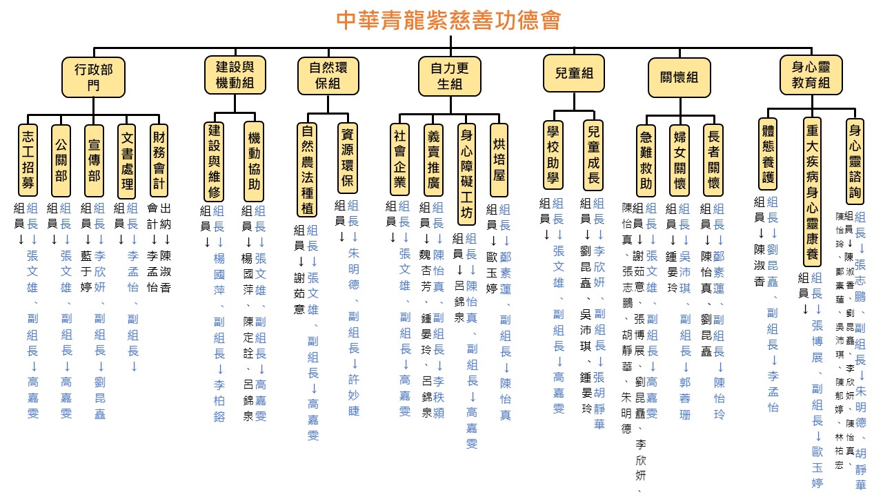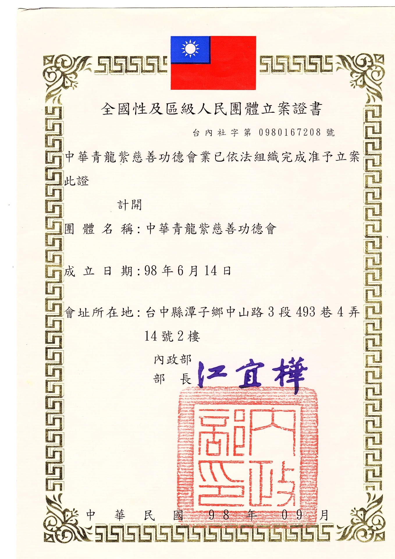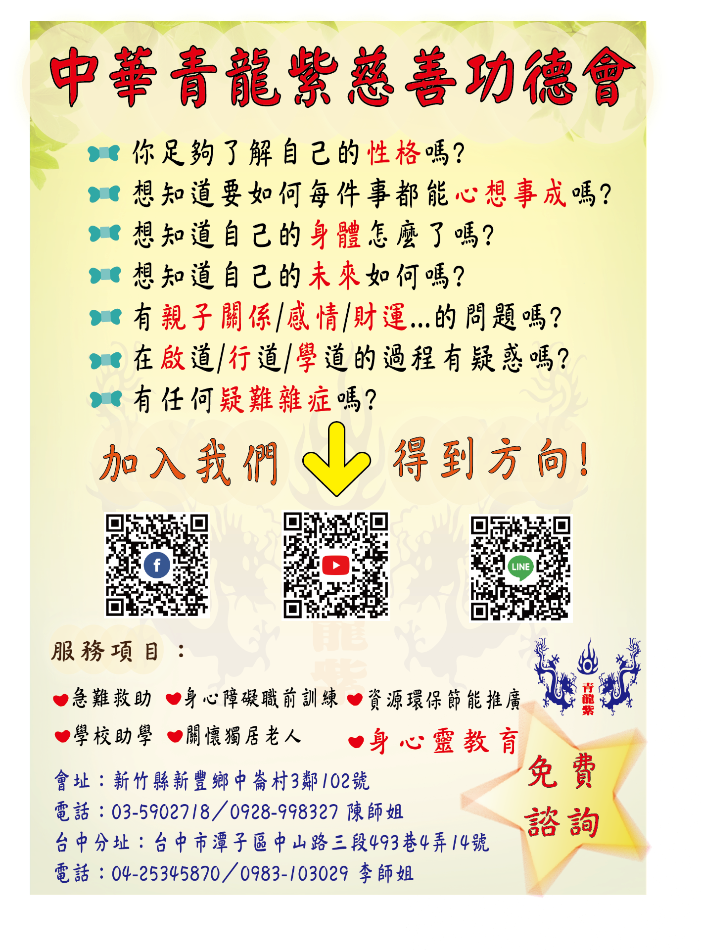 發揚人飢己飢,人溺己溺之精神,持續幫助弱勢學童助學,對於急難個案給予關懷與救助;成立青龍紫工坊,鼓勵身心障礙朋友自食其力,期望達到幼有所長,壯有所用,老有所終,鰥寡孤獨廢疾者皆有所養的大同世界。